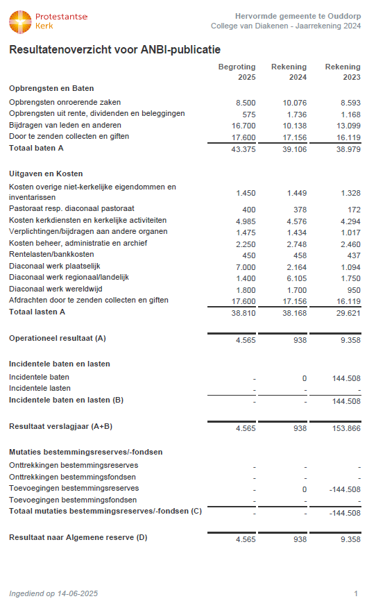 De Protestantse Kerk verwoordt in de eerste hoofdstukken van de Kerkorde wat zij gelooft en belijdt. Dit vormt de basis van haar kerkstructuur, haar organisatie, haar kerkrecht, haar ledenadministratie, haar arbeidsvoorwaarden en haar financiën. 1 - De Protestantse Kerk in Nederland is overeenkomstig haar belijden gestalte van de ene heilige apostolische en katholieke of algemene christelijke Kerk die zich, delend in de aan Israël geschonken verwachting, uitstrekt naar de komst van het Koninkrijk van God. 2 - Levend uit Gods genade in Jezus Christus vervult de kerk de opdracht van haar Heer om het Woord te horen en te verkondigen. 3 - Betrokken in Gods toewending tot de wereld, belijdt de kerk in gehoorzaamheid aan de Heilige Schrift als enige bron en norm van de kerkelijke verkondiging en dienst, de drie-enige God, Vader, Zoon en Heilige Geest. Zie verder: artikelen I t.m. IV van de kerkorde van de Protestantse Kerk “de roeping van kerk en gemeente” D. Beleidsplan. Het beleidsplan van de Protestantse Kerk kunt u vinden via deze link: https://www.protestantsekerk.nl/anbi-pkn/ zoeken op beleidsplan 2021-2025 “de toekomst open tegemoet” Op de website www.hervormdouddorp.nl vindt u het beleidsplan van onze gemeente. E. Beloningsbeleid. De beloning van diaconale medewerkers – indien aanwezig - is geregeld in de ‘Arbeidsvoorwaardenregeling Protestantse kerk in Nederland’. De hierop betrekking hebbende regelingen vindt u via deze link: Generale regelingen Protestantse Kerk in Nederland. Leden van kerkenraden, colleges en commissies ontvangen geen vergoeding voor hun werkzaamheden. Alleen werkelijk gemaakte onkosten kunnen worden vergoed. F. Verslag Activiteiten. De kerkenraad heeft de algemene eindverantwoordelijkheid voor het in stand houden van een levende gemeente. Dat doen zij door zoveel mogelijk gemeenteleden in te schakelen bij het plaatselijk werk. Enkele taken zijn conform de kerkorde gedelegeerd naar afzonderlijke colleges, waaronder het College van Kerkrentmeesters en het College van Diakenen. Zij waken over de financiële slagkracht van de gemeente en leggen via een jaarverslag rekening en verantwoording af aan de kerkenraad. Een uittreksel van de belangrijkste gegevens treft u hieronder aan. G. Voorgenomen bestedingen. De verwachte bestedingen (begroting) sluiten als regel nauw aan bij de rekeningen over de voorgaande jaren. Het plaatselijk diaconaal werk vertoont een grote mate van continuïteit: In de kolom begroting in het overzicht onder H is dit cijfermatig in beeld gebracht. H. Verkorte staat van baten en lasten met toelichting. Onderstaande staat van baten en lasten geeft via de kolom begroting inzicht in de begrote ontvangsten en de voorgenomen bestedingen van de diaconie in het verslagjaar. De kolom rekening geeft inzicht in de daadwerkelijk gerealiseerde ontvangsten en bestedingen. De voorgenomen bestedingen voor het komende jaar zullen niet sterk afwijken van de voorgenomen bestedingen van het verslagjaar. ![]() Toelichting Kerkgenootschappen en hun onderdelen zorgen in Nederland zelf voor de benodigde inkomsten voor hun activiteiten. Aan de kerkleden wordt elk jaar gevraagd om hun bijdrage voor het diaconale werk van de diaconie van de kerkelijke gemeente waartoe zij behoren. Soms bezit een diaconie ook (enig) vermogen in de vorm van woningen, landerijen of geldmiddelen. Soms is dit aan de diaconie nagelaten met een specifieke bestemming. De opbrengsten van dit vermogen worden aangewend voor het werk van de diaconie. De ontvangen inkomsten van de diaconie worden besteed aan diaconaal werk, zowel plaatselijk, landelijk als wel wereldwijd in de vorm van ondersteuning van activiteiten en doorbetaling van voor specifieke projecten gehouden inzamelingen. Daarnaast worden de ontvangen inkomsten ook besteed aan de kosten van de eigen organisatie (eventueel overig personeel, vrijwilligers) en bijdragen voor het in stand houden van het landelijke diaconale werk van de kerk. Onder lasten beheer en administratie zijn opgenomen de kosten voor administratie en beheer van de diaconale bezittingen. | ||||||||||||||||